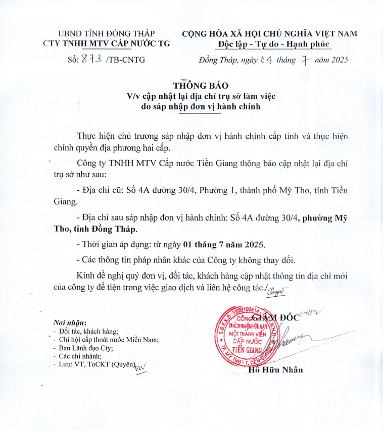 Thông báo cập nhật lại địa chỉ trụ sở làm việc Công ty TNHH MTV Cấp nước Tiền Giang