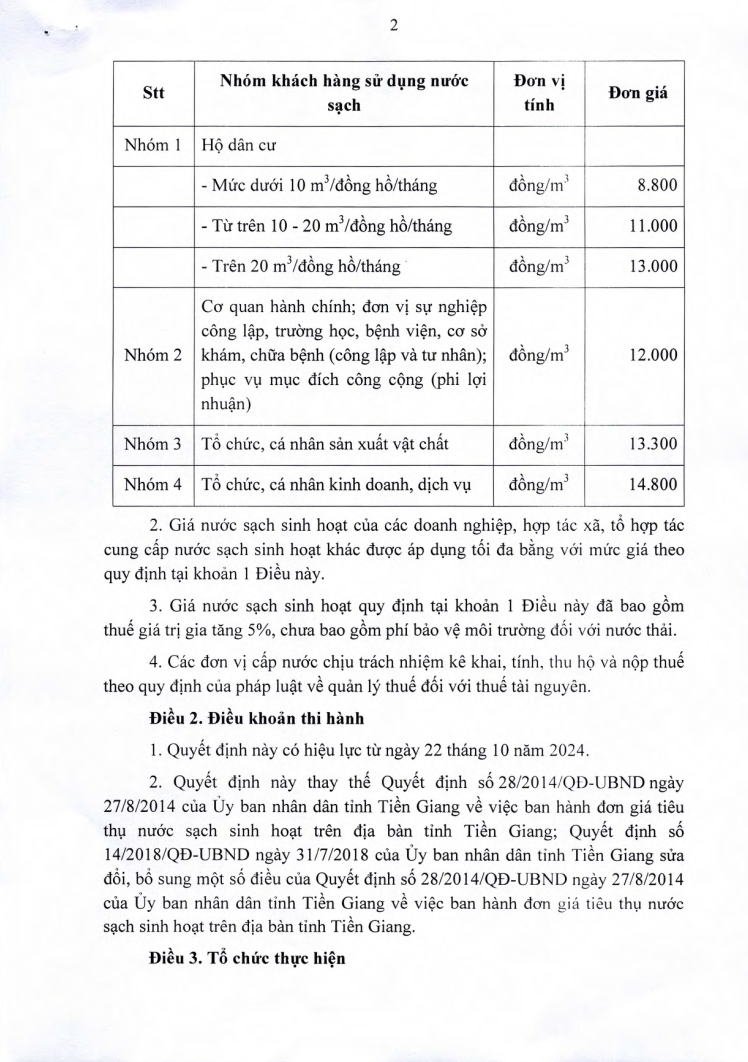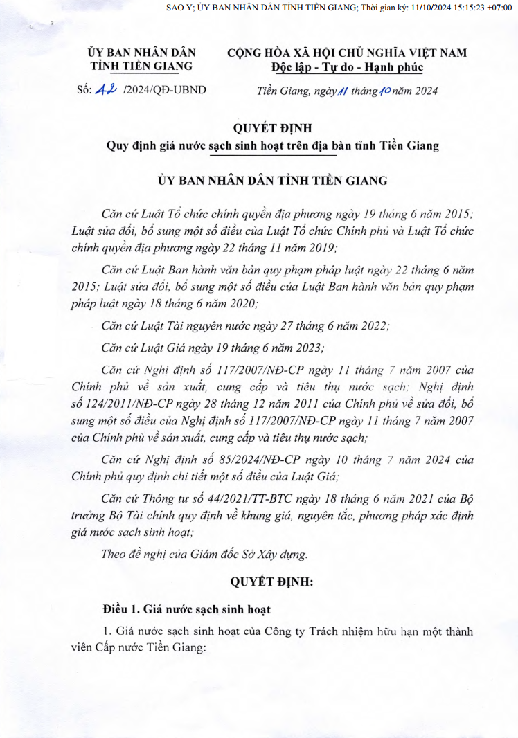 Quyết định quy định giá nước sinh hoạt trên địa bàn tỉnh Tiền Giang