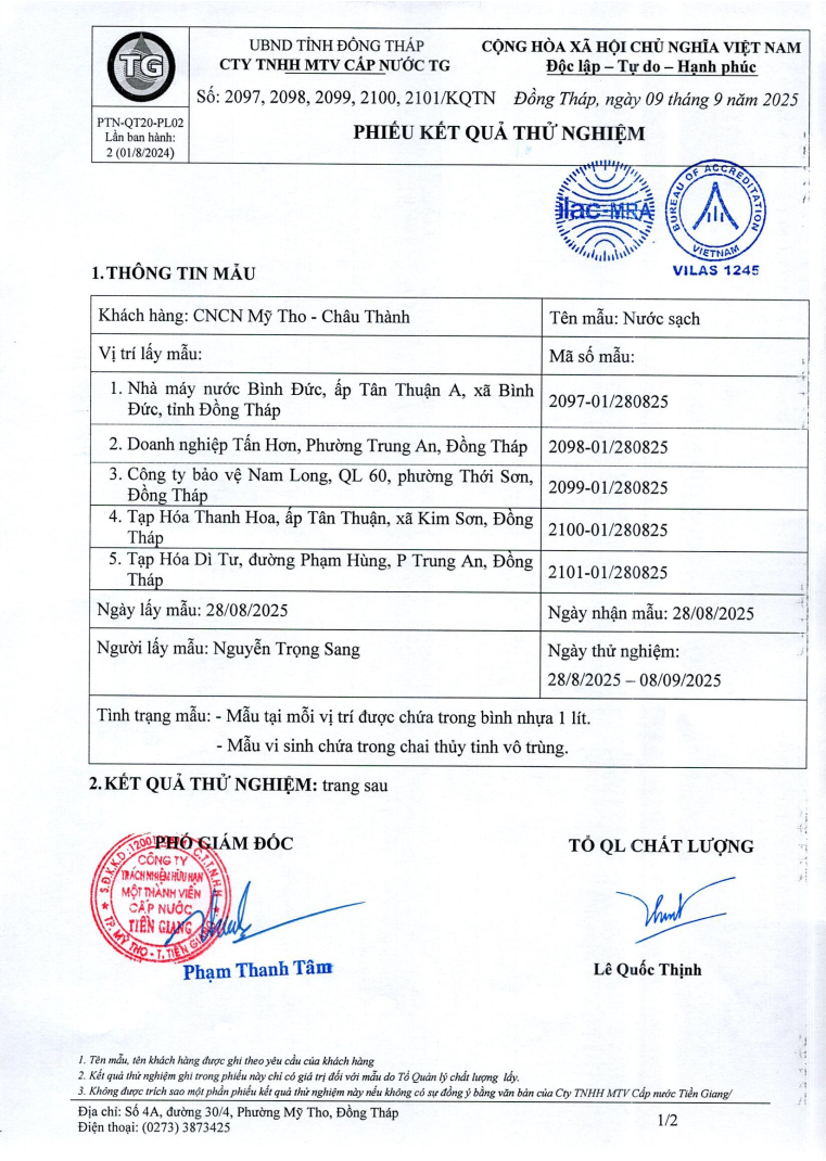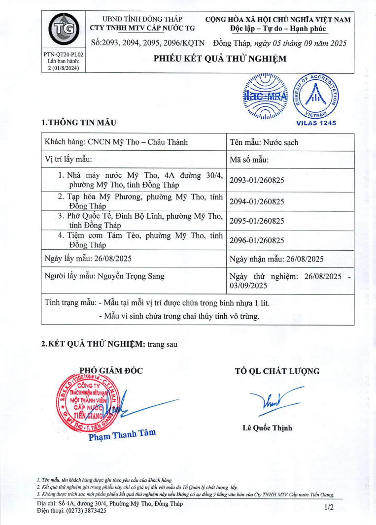 Kết quả nội kiểm chất lượng nước sạch của nhà máy nước Mỹ Tho và Bình Đức tháng 8/2025
