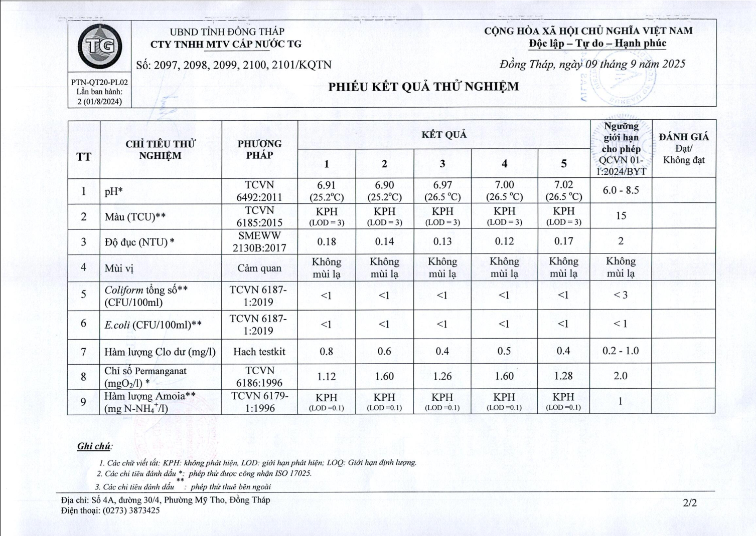 Kết quả nội kiểm chất lượng nước sạch của nhà máy nước Mỹ Tho và Bình Đức tháng 7/2025