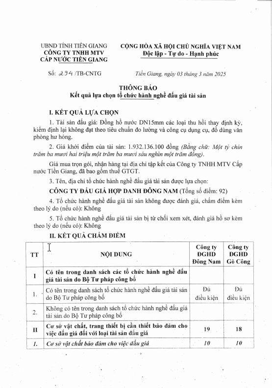 THÔNG BÁO KẾT QUẢ LỰA CHỌN TỔ CHỨC ĐẤU GIÁ TÀI SẢN