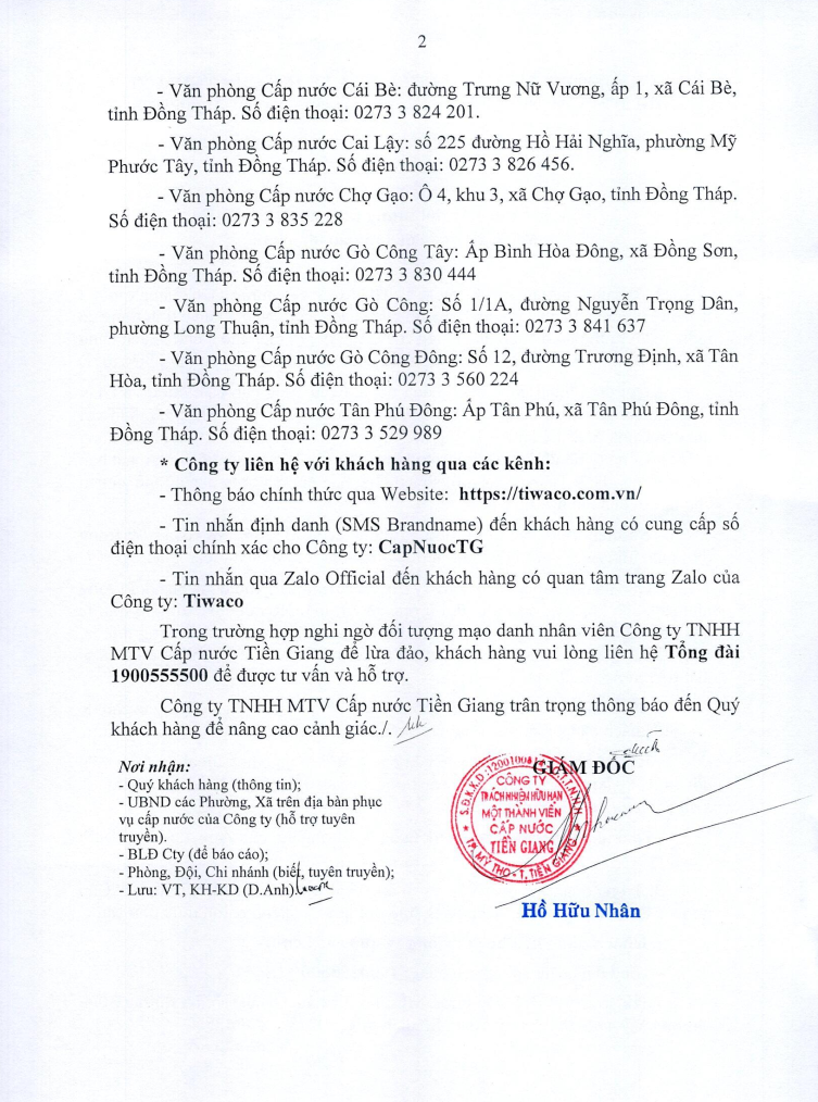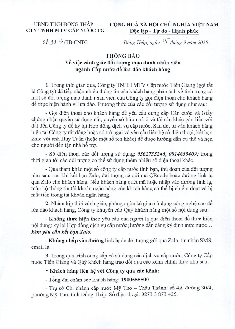 Trong thời gian qua, Công ty TNHH MTV cấp nước Tiền Giang đã tiếp nhận nhiều thông tin của khách hàng phản ánh về tình trạng có một số đối tượng mạo danh nhân viên của Công ty gọi điện thoại cho khách hàng đế thực hiện hành vi lừa đảo